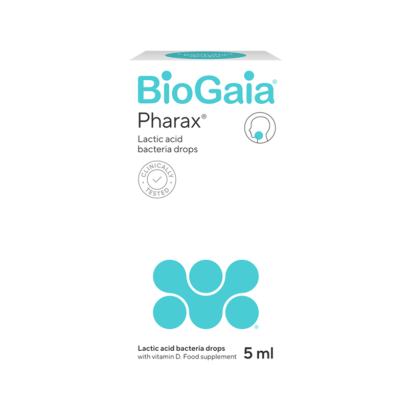 BioGaia Pharax on toidulisand, mis täiendab seedetrakti, sealhulgas suu ja kurgu loomulikku mikrofloorat. See sisaldab ainulaadset tüvede kombinatsiooni: suuõõnest eraldatud Limosilactobacillus reuteri ATCC PTA 5290 ja rinnapiimast eraldatud Limosilactobacillus reuteri DSM 17938 (Protectis). Seda on põhjalikult uuringutes testitud ning selle ohutust ja mõju kirjeldatud. Lisaks sisaldab BioGaia Pharax D3-vitamiini, mis on oluline immuunsüsteemi normaalsele toimimisele. See sobib üle 6. kuu vanustele lastele ja täiskasvanutele. Soovitatav kasutamine: kaks korda päevas viis tilka annavad soovitatava päevase annuse 400 miljonit elusat Limosilactobacillus reuteri bakterit ja 10 µg D3-vitamiini vähemalt 10 päeva jooksul. Saadaval 5 ml pakendis.
